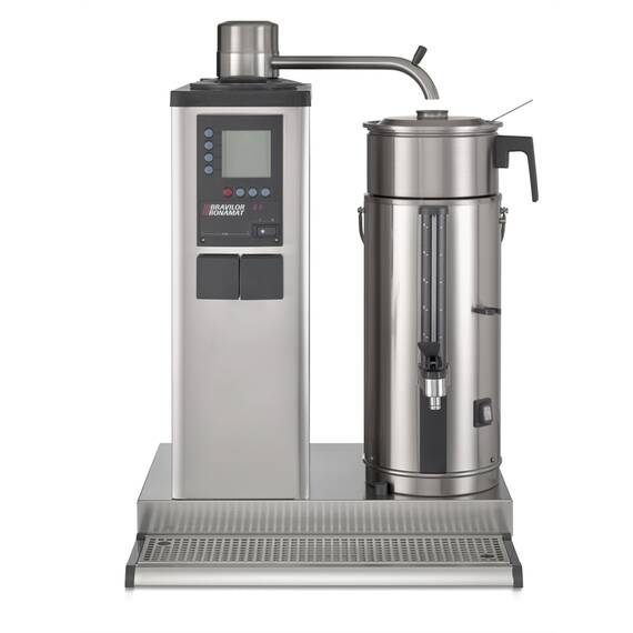 Bonamat Rundfilter Kaffeemaschine B5 L/R - 230 V Rundfiltergerät für Orte mit Wasseranschluss. Brüht große Mengen an Kaffee in separate Behälter. Ausgestattet mit Digitalanzeige, Gesamt- und Tageszähler, Entkalkungssystem, "Kaffee fertig" Signal, integrierter Zeitschaltuhr und optimalen Sicherheitsmechanismen. Einschließlich Behälter(n) Typ VHG, Filtereinheit(en) und Tropfblech. Modell mit 1 Brühsystem und 1 Behälter à 5 Liter (links oder rechts von der Säule). Dies ermöglicht es Ihnen, so genannte doppelte oder dreifache Geräte zusammenzustellen. Stärken Schnell große Mengen an frischem FilterkaffeeDas Edelstahlgehäuse verleiht ein robustes und qualitativ hochwertiges ErscheinungsbildAusgestattet mit "Kaffee fertig" Signal, Gesamt- und Tageszähler und integrierter ZeitschaltuhrEntkalkungssystem und optimale SicherheitsmechanismenKaffee gleich bleibender Qualität: Die Behälter kontrollieren die Kaffeequalität Rundfilter Kaffeemaschinen Benötigen Sie große Kaffeemengen? Schnell und frisch? Die Antwort hierauf lautet: Ein Bravilor Bonamat Rundfiltergerät. Perfekt auf Stoßzeiten ausgerichtet, z.B. für Pausen im Theater oder für die Kaffeetheke im Krankenhaus. B-Serie Rundfiltergerät für Orte mit Wasseranschluss. Brüht große Mengen an Kaffee in separate Behälter. Ausgestattet mit Digitalanzeige, Gesamt- und Tageszähler, Entkalkungsprogramm, "Kaffee fertig" Signal, integrierter Zeitschaltuhr und optimalen Sicherheitsmechanismen.